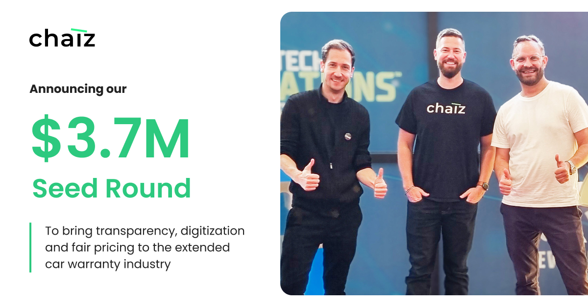 Austin, TX - [August 7, 2024] - Chaiz, the first comparison marketplace for extended car warranties announced an oversubscribed $3.7 million seed funding round today led by ResilienceVC. Anker Capital, Automotive Ventures, Everywhere Ventures, FJ Labs, Monte Carlo Capital, Never Lift Ventures, RedBlue Capital, and Springtime Ventures also participated. Previous investors include Everywhere VC, InsurTech NY, The Calm Fund, and Project One Auto, a nationwide auto dealership. Chaiz, based in Austin and founded by auto and tech industry veterans Ryan Hartman, Philippe Koenig, and Reto Bolliger, is focused on bringing transparency, choice, and digitization to the extended car warranty market.